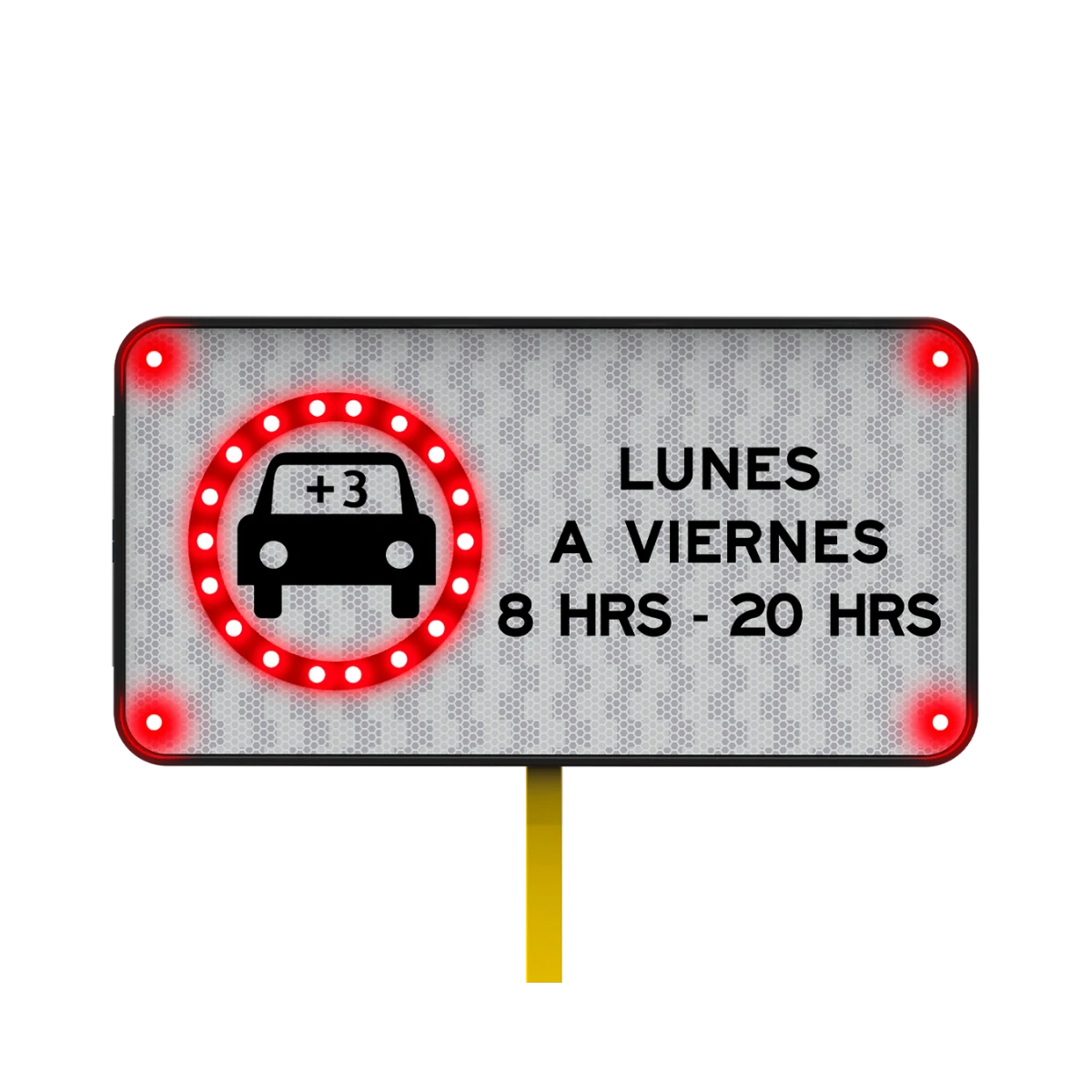 La visibilidad es un factor clave, por lo que la Señal Lunes a Viernes está adicionada con un reflejante tipo A o tipo B, dependiendo de la preferencia del cliente. Este material refleja la luz de los vehículos, asegurando que la señal sea perfectamente visible tanto de día como de noche, incluso en condiciones de baja visibilidad.
